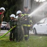 Die Jung — Florianis besetzten sofort das Tanklöschfahrzeug und ein Pumpenfahrzeug und schon ging es los.