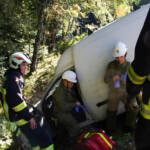 Zwei Fahrzeuge kollidierten miteinander und blieben in einer Böschung hängen. Zuerst galt es einen Fahrzeuglenker über die steile Böschung, möglichst schonend zu retten.
